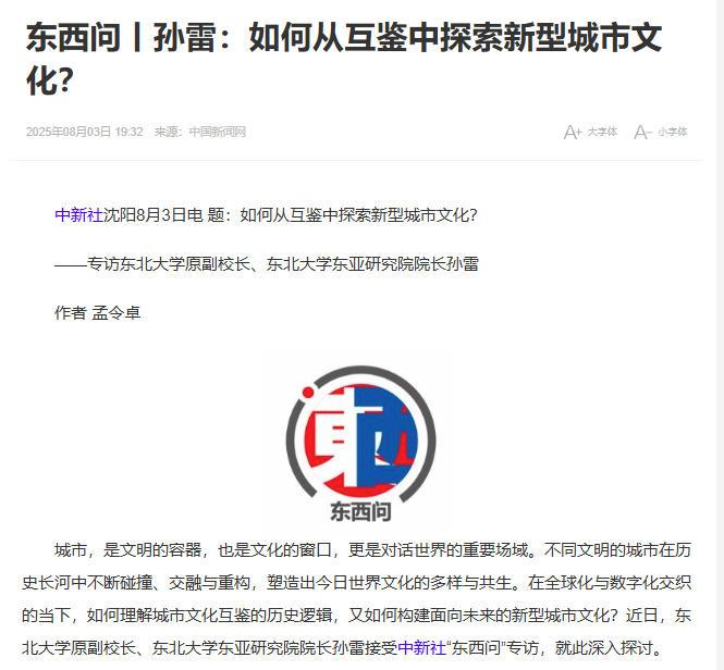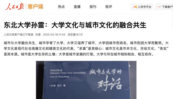 “大学因城市而扬名,城市因大学而繁荣。”孙雷教授始终致力于阐明大学文化与城市文化的互动逻辑:精神引领与实践反哺的双向赋能。大学不仅是知识的高地,更是创新的引擎、文明的灯塔;城市也不仅是大学的地理依托,更是其价值实现的重要土壤。人民日报客户端曾以“大学文化与城市文化的融合共生”为题梳理其观点与实践:用文化赋能城市更新、用学术服务社会治理、用平台激活校友资源,把高校的思想火种、人才资源与制度供给,化作一座城市可感可及的进步力量。他主持的“辽宁省公共政策与城市文化研究基地”,成为连接东北大学与辽沈地区的重要桥梁。他推动成立的“沈阳市大学文化与城市文化研究中心”,为沈阳这座历史文化名城注崭新的文化活力。