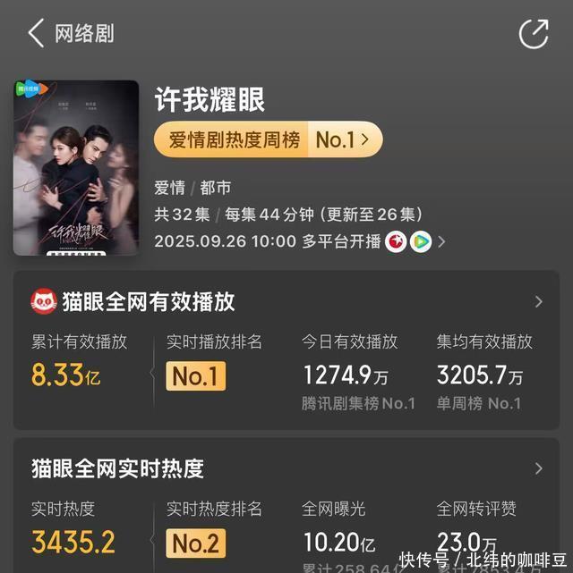 编辑|司徒夜 《许我耀眼》在毫无宣发的情况下,突然空降播出。 本以为这是一部“弃子”,没想到却是一匹“黑马”。 截至10月10日,《许我耀眼》实时播放量位居全网第一,累计播放量超8亿。